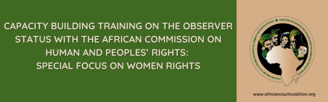 Capacity Building Training on the Observer Status with the African Commission on Human and Peoples’ Rights: Special Focus on Women Rights 12 December 2023 The African Court Coalition calls for applications for a virtual training on the Observer Status with the African Commission on Human and Peoples’ Rights. OBJECTIVE OF THE TRAINING The main objective of the...